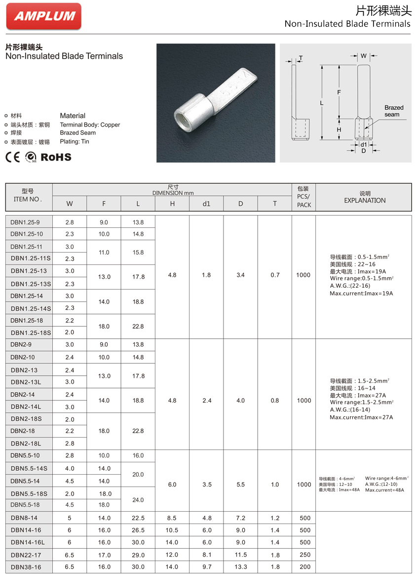 产品特点:采用优质亚光电镀,防锈时间大大加长,无锋利部位;配套安普伦端子钳即可压紧电线,接线美观,